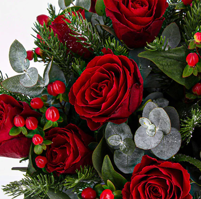 Bouquet de Noël rouge et vert, composé de roses, branches de sapin et petites baies rouges.