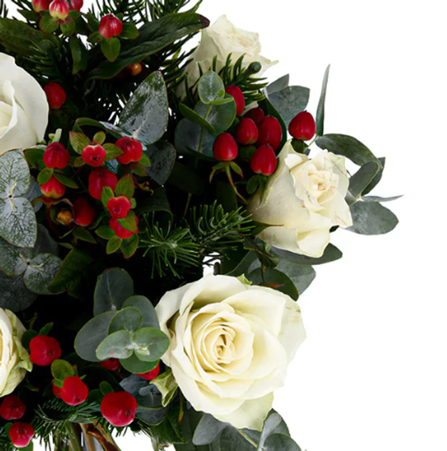 Bouquet de Noël blanc, rouge et vert, composé de roses, branches de sapin et petites baies rouges.
